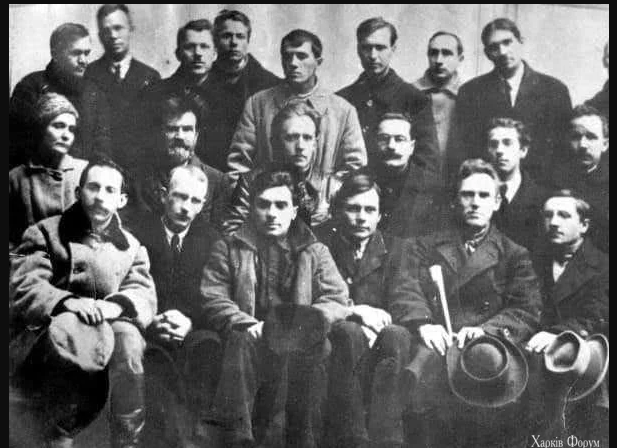 Зустріч харківських і київських митців. Київ, 1923. Зліва направо, перший ряд: Максим Рильський, Юрій Меженко, Микола Хвильовий, Майк Йогансен, Григорій Михайлов, Михайло Вериківський. Другий ряд: Наталя Романович, Михайло Могилянський, Василь Еллан-Блакитний, Сергій Пилипенко, Павло Тичина, Павло Филипович. У третьому ряду стоять: Дмитро Загул, Микола Зеров, Михайло Драй-Хмара, Григорій Косинка, Володимир Сосюра, Тодось Осьмачка, Володимир Коряк, Михайло Івченко